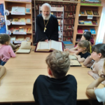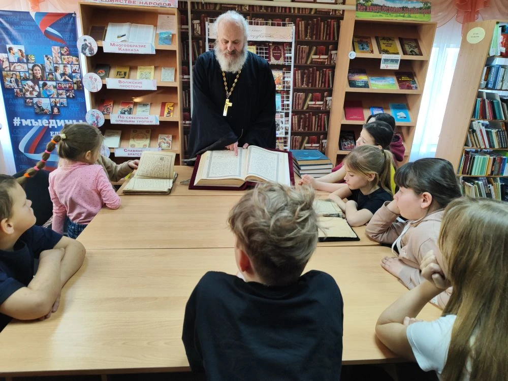 15 марта в Димитровской библиотеке поселка Ровеньки прошла встреча с клириком Свято-Троицкого собора поселка Ровеньки иереем Сергием Гульченко, посвященная Дню православной книги. Отец Сергий напомнил присутствующим о том, что первая печатная книга на Руси, «Апостол», появилась благодаря трудам Ивана Федорова. На встречу с ребятами священнослужитель принес с собой «Евангелие» и «Псалтирь» издания 19 века. Дети внимательно изучали эти книги, обращая внимание на красочное оформление, и даже с увлечением пробовали читать текст на церковнославянском языке. Священнослужитель отметил, что духовная литература не просто рассказывает нам о религиозных истинах и преданиях, но и учит жизненным принципам.